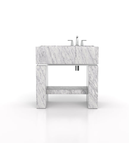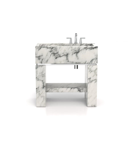 The Broadway Vanity Sink is designed with meticulous attention to detail, featuring a criss-cross pattern that mirrors the iconic street's dynamic energy. This design is both a standout element in any bathroom and a masterpiece of geometric precision. Adorned with accents of polished aluminum, satin nickel, and luminous brass, the vanity exudes opulence and sophistication. Its sculptural form, giving the impression of being carved from a solid block of stone, serves as a captivating centerpiece, elevating the ambiance of any bathroom space with its timeless allure.