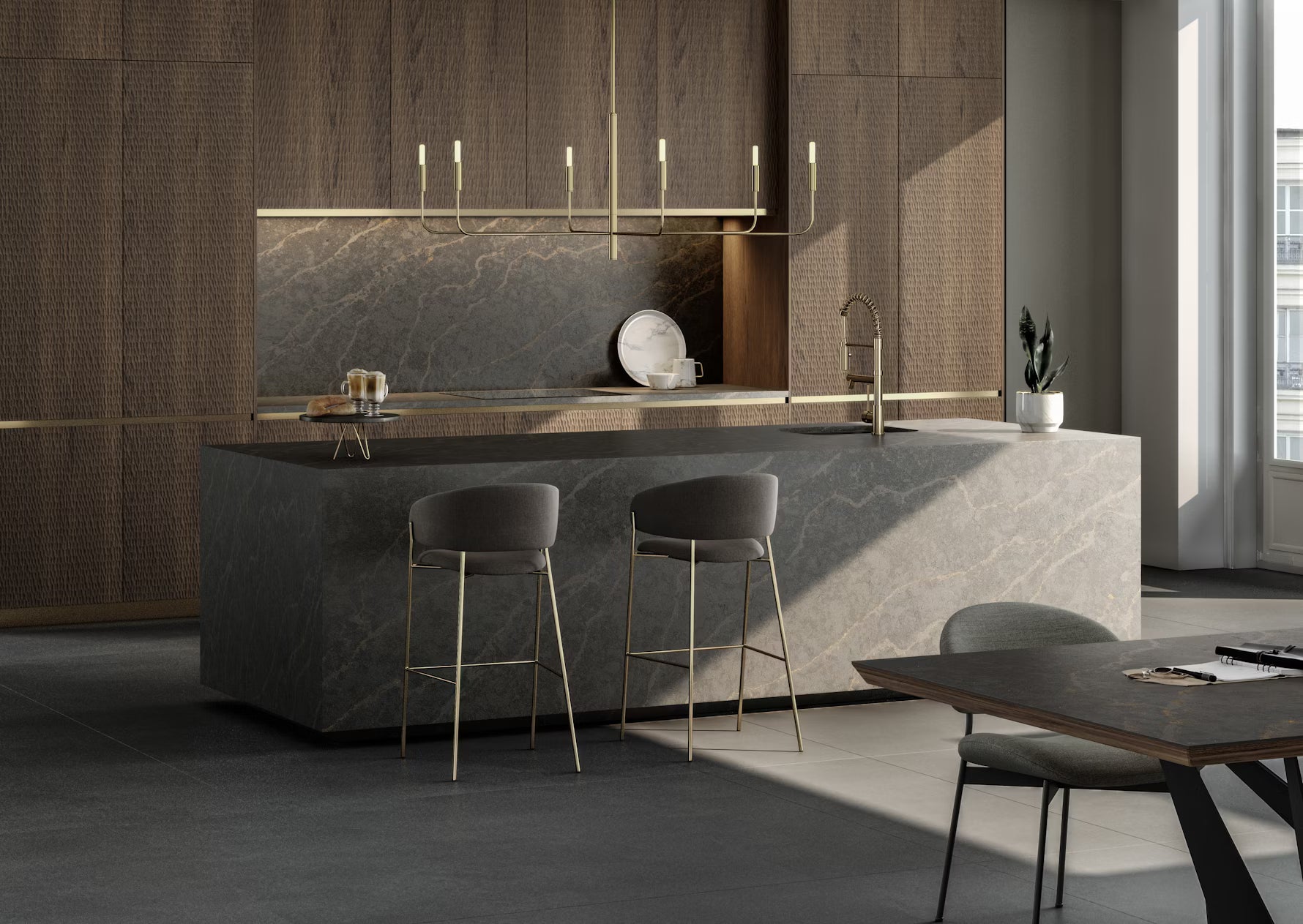 Imagine molten gold frozen in stone—that's Bohemian Flame Silestone. Delicate copper and silver threads dance across the surface like candlelight flickering against volcanic ash, while metallic flecks catch the light with every glance. Inspired by nature's most dramatic moments, this surface transforms any space into a gallery of movement and warmth. A countertop that tells the story of fire, elegance, and timeless beauty.