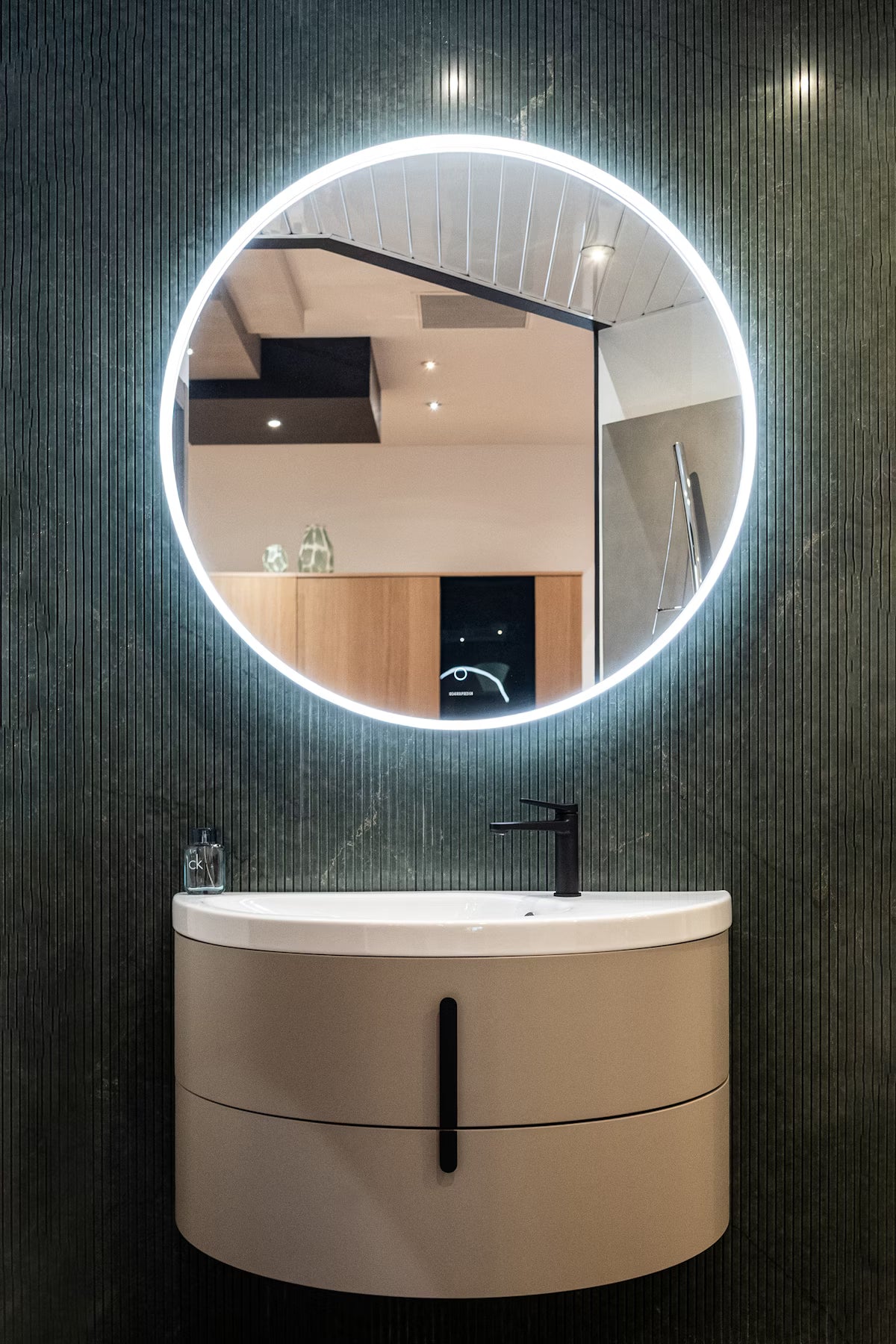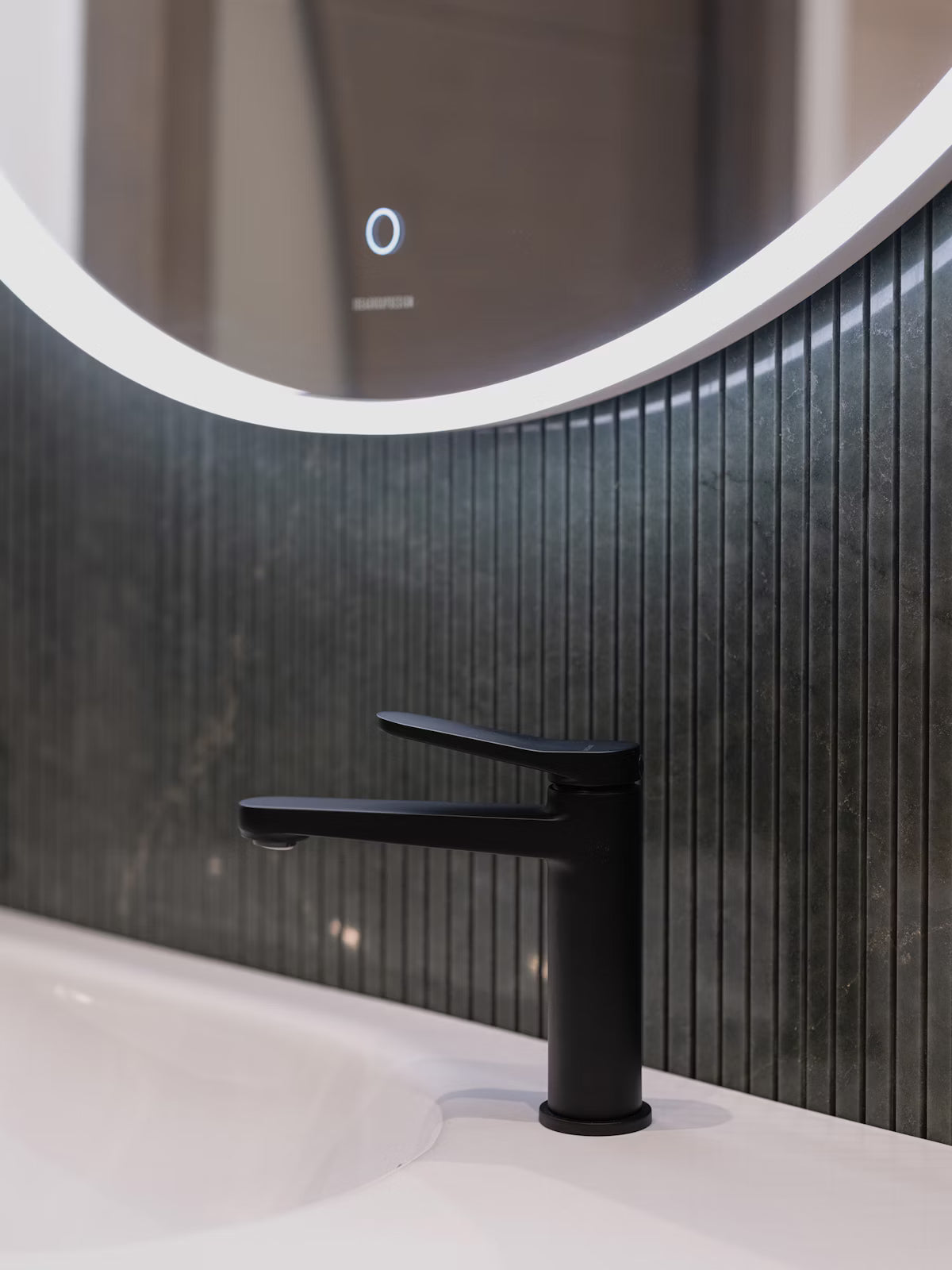 The Ukiyo Jardin Emerald GV2 by Claudia Afshar celebrates the natural grandeur of green marble through the calm geometry of the Ukiyo design language. Its surface reveals deep forest hues intertwined with delicate white and bronze veining, recalling the layered intensity of rare gemstones and the quiet elegance of nature’s most sophisticated palette. The GV2 profile brings a broader, more architectural rhythm to this luxurious tone. Each panel features 15 gently fluted grooves, approximately 0.20 in (5 mm) wide and 0.12 in (3 mm) deep, with 0.98 in (25 mm) between grooves. Beginning with a smooth strip and concluding with a groove, the pattern creates a measured cadence of light and shadow that feels sculpted yet organic.